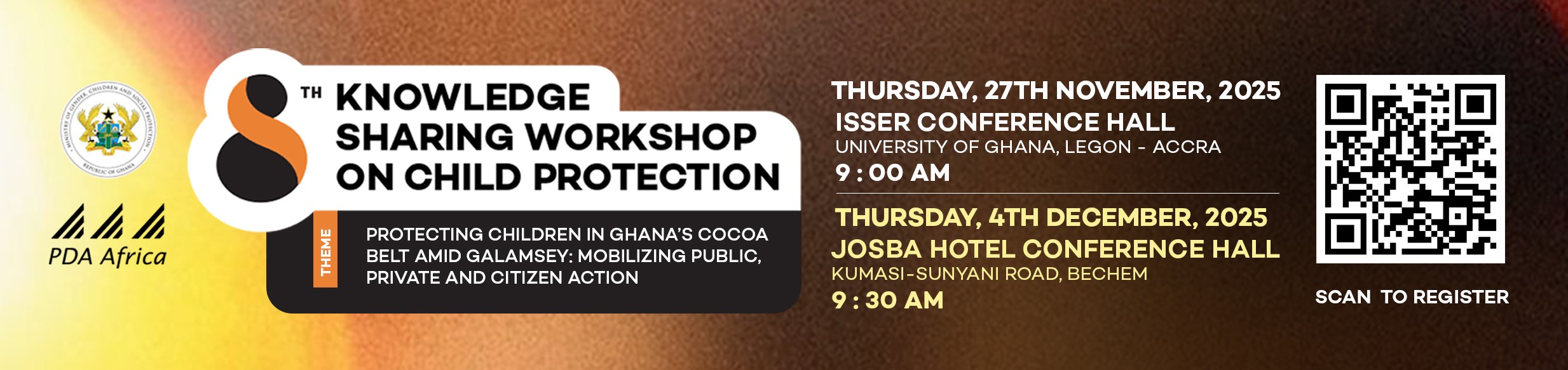 Participatory Development Associates (PDA), in partnership with the Department of Children under the Ministry of Gender, Children and Social Protection, convened the 8th Knowledge Sharing Workshop on Child Protection (KSWoCP) with two multi-level events in Accra and Bechem. The 2025 edition of the workshop brought together national and community stakeholders to address the growing threat of illegal mining galamsey to children in Ghana’s cocoa-growing regions.
